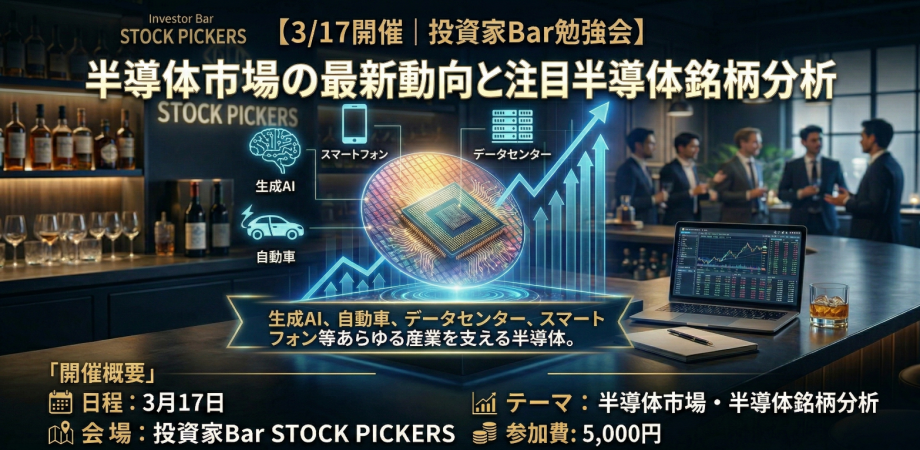 ▼開催概要▼-----------------------------------------------------------------------------------------------------【日時】3月17日㈫ 19:30 - 21:30【会場】投資家バーStockPickers(東京都中央区銀座8-2-14竜王ビルV4F)【内容】半導体市場・半導体銘柄分析【費用】5,000円(入店料&オリジナルカクテル2杯🍸として)【主催】株式会社シュタインズ【登壇】立野新治 氏(株式会社シュタインズ 取締役)、齊藤大将 氏(株式会社シュタインズ 代表取締役)
