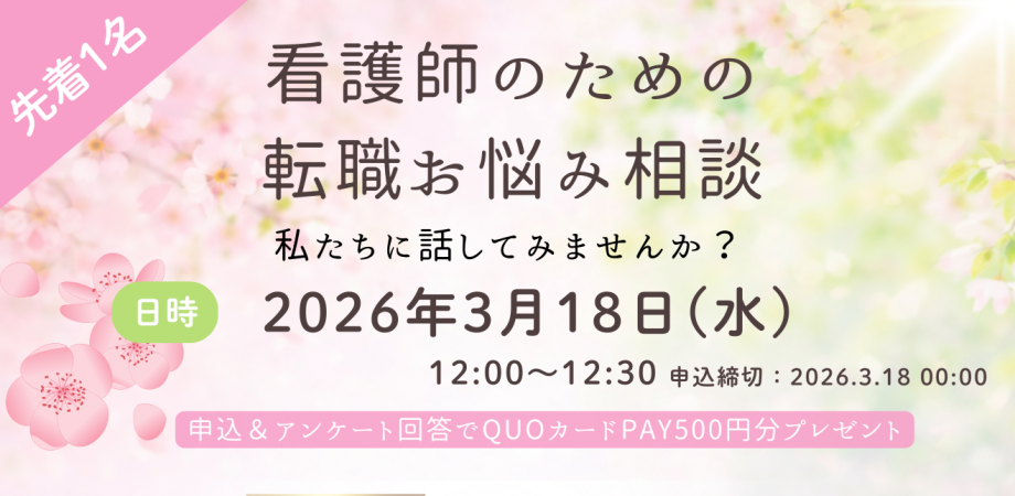 イベント詳細 「今の働き方、これでいいのかな?」「転職って、本当にすべき?」そんな迷いや悩みを抱えている看護師の方へ。