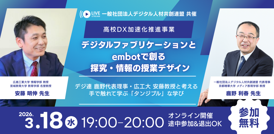 一般社団法人デジタル人材共創連盟 共催 【高校DX加速化推進事業】 機材を「置物」にしない!デジタルファブリケーションとembotで創る、探究・情報の授業デザイン 〜デジ連 鹿野代... powered by Peatix : More than a ticket.