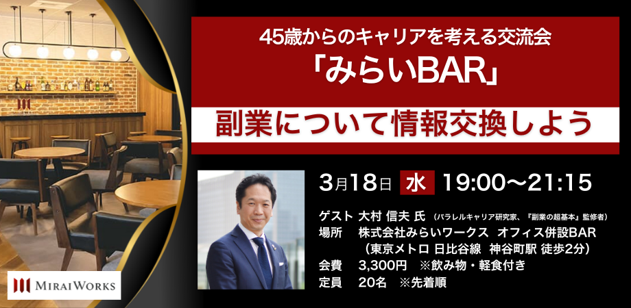 イベント詳細 45歳からのキャリアを考える交流会「みらいBAR」~副業について情報交換しよう~