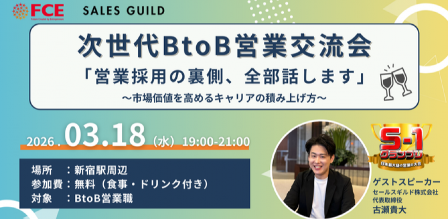 20代〜30代の営業パーソン向け交流会を開催します。トークセッションでは、日本最大級の営業大会「S-1グランプリ」を主催し、セールスギルド株式会社の経営者でもある古瀬氏に営業としてのキャリアのリアルをお話いただきます。同世代ならではのリアルな悩みや成功・失敗を共有し、明日からすぐに使えるヒントや気づきが得られる場です。先着50名様限定となりますのでお早めにお申し込みください。