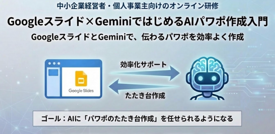 イベント詳細 【イベント概要】パワポ資料づくりに時間を取られがちな中小企業経営者・個人事業主の方向けに、Googleスライド×Geminiを使って「AIにたたき台を作らせる」方法を学ぶ入門セミナーです。