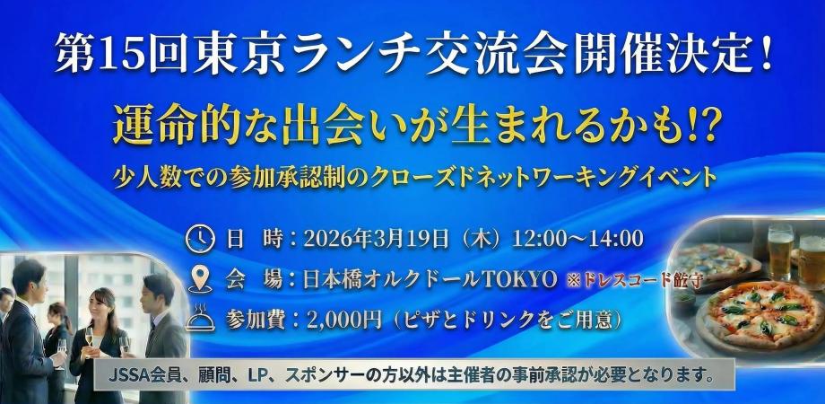 日時:2026年3月19日(木)12:00〜14:00 会場:オルクドールTOKYO〒103-6130東京都中央区日本橋2丁目5-1 髙島屋三井ビルディング31階直行日本橋髙島屋三井ビルディング 9階の東海東京証券の受付で入館書を受け取り31階会場へエレベーターで移動となります。主催:一般社団法人 日本スタートアップ支援協会定員:30名 ※1社2名まで、2名で参加の場合は、それぞれ別途入力をお願いします。定員に達すると締め切りとさせていただきます。ドレスコード:Tシャツ・短パン・サンダル等のカジュアルな服装や、軽装でのご来館はご遠慮いただいております。参加費:2,000円(ピザとソフトドリンクをご準備しています)領収書は下記から発行申請をお願いします。https://help-attendee.peatix.com/ja-JP/support/solutions/articles/44001821741参加資格:部長職以上の決裁権のある方となります。本イベントは交流会の質を高めるために少人数で開催します。JSSA会員・顧問・LP・スポンサー、審査採択社のみのクローズドネットワーキングイベントになりますのでご了承ください。JSSA会員・顧問・LP・スポンサーは優先的に参加できます。少人数で開催しますので一般の方は下記の参加審査申請フォームに入力をお願いします。初参加の方を優先します。▼参加審査申請フォーム https://forms.gle/6p6nU1TLdBJCfAYz7※資金調達の仲介業の方のご参加はトラブルが多いのでお断りします。