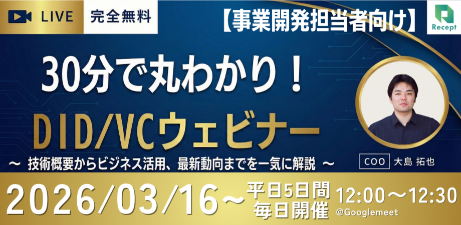 ・開催日:2026年3月19日(木)12:00~12:30・スピーカー:大島 拓也(株式会社Recept COO)・テーマ:30分で丸わかり!DID/VCウェビナー・形式:オンライン(配信予定)・視聴URL:お申込みいただいた方に追って送付いたします・参加費用:無料・アーカイブ配信:なし(予定)