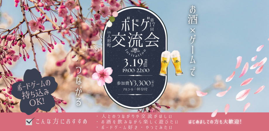 毎月恒例のボードゲーム交流会、第17回の開催が決定しました🎉3月は少しずつ春の気配🌸暖かい日も増えてきて、新しい出会いや気分転換がしたくなる季節。お酒を片手に、ボードゲームを囲んでゆるっと交流しませんか?「ボードゲームが好きな方」も「ちょっと興味がある方」も、お酒を片手に、気軽に交流できるのがこのイベントの魅力です✨初めて&お一人でのご参加大歓迎!毎回違う発見があるので、もちろんリピーターの方もお待ちしております🫶