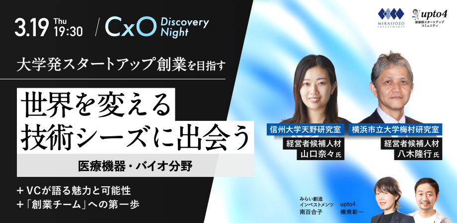イベント詳細 upto4は、スタートアップに関心のある方が、創業初期スタートアップ創業者やベンチャーキャピタル、創業を予定する技術シーズ保有研究者と気軽な情報交換や週2-3時間からスタートアップに参加できるコミュニティを作っています。今回、upto4と東京科学大学関連VCのみらい創造インベストメンツによる起業イベントを開催いたします。みらい創造インベストメンツは東京科学大学を中心に技術系ベンチャーへの投資、創業、育成支援を行う独立系民間VCです。