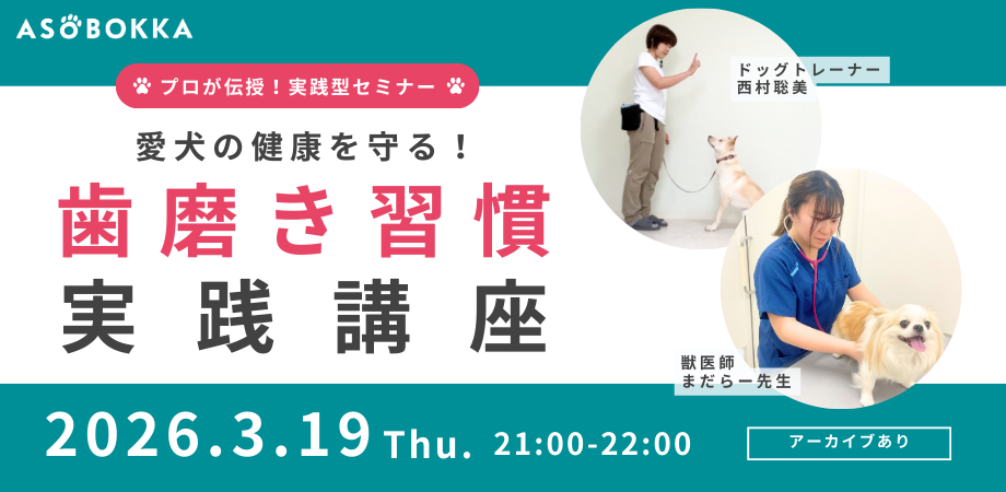 ■ 開催概要日時: 3月19日(木) 21:00 ~ 22:30(予定)形式: オンライン(Youtube live)参加費: 2,800円参加特典: 愛犬との暮らしを豊かにするコミュニティ「ASOBOKKA」を、お得に体験できるスペシャルクーポンをプレゼント! ■ 講師紹介● まだらー先生(獣医師)臨床の現場で多くの症例と向き合う現役獣医師。医療の観点から、予防歯科の重要性を分かりやすく伝えます。
