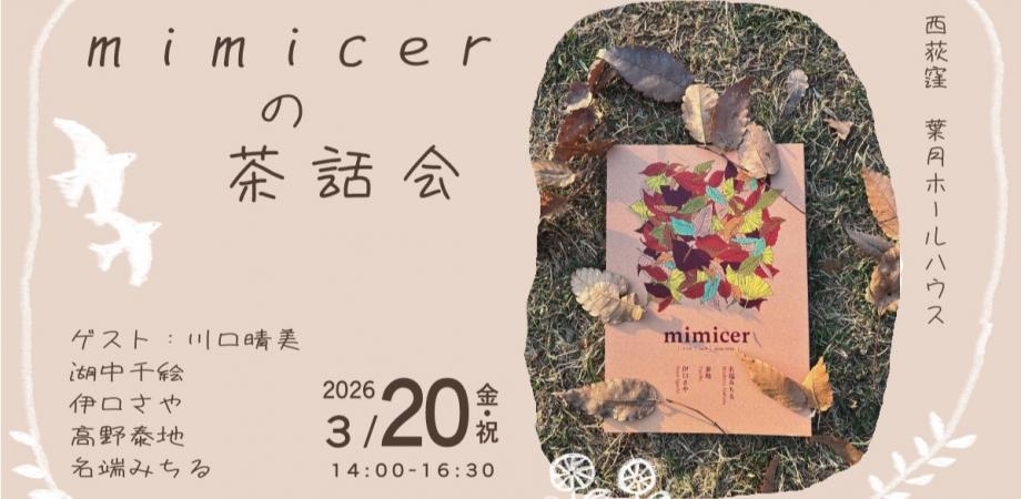 川口晴美さんに詩を教わった仲間を中心に集まって発行している詩の雑誌「mimicer」のメンバーによるトークとリーディングをメインにした茶話会を行います。