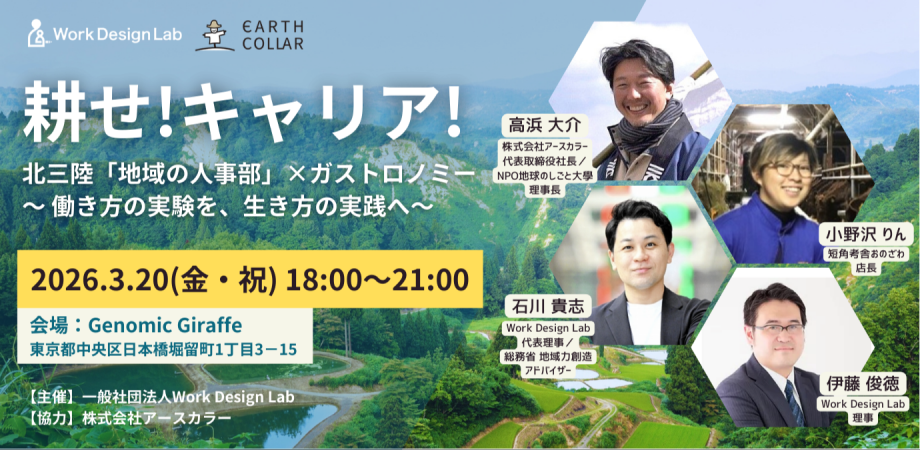 そんな想いを持つ皆様、北三陸が誇るブランド食材「短角牛」を味わいながら、あなたの「次のステージ」を一緒にデザインしませんか?<こんな方におすすめ>・事業開発・プロジェクトマネジメントの経験を地域で試したい方・金融・ファンド組成の知見を、地方創生の実践に活かしたい方・研修開発・ファシリテーションのプロとして、新しい学びの場を作りたい方・北三陸の食文化や、持続可能なライフスタイルに興味がある方<イベント概要>【開催日時】2026年3月20日(金・祝)18:00~21:00【会 場】Genomic Giraffe(東京都中央区日本橋堀留町1-3-15)【定 員】20名(現地参加)、20名(オンライン)【参 加 費】現地参加のみ:5,000円(料理+ワインのペアリング含む)【申 込】Peatixからお申し込みをお願いいたします。 ※Peatixへの登録・ログインが必須となります。<タイムスケジュール> 【第1部:ビジョン・シェアリング】(18:00〜19:25)・オープニング対談 「働き方のデザインから、地域の未来デザインへ」 ・プロジェクト・プレゼンテーション 学びで終わらない、実践型フィールド「北三陸」の挑戦。 【募集中のミッション】 ① 国民宿舎「くろさき荘」&ごちゃまぜ寮の支配人候補 ② 一次産業xテクノロジー研修の創出「ハイテク留村」研修開発・ファシリテーター ③ 「地球のしごと財団(仮)」の企画・運営・食材ストーリー紹介 小野沢 りん氏による、短...