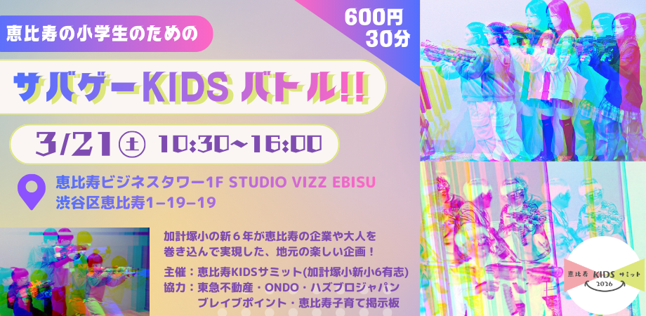 【対象】恵比寿周辺を中心とした、渋谷区民の小学生(新1〜6年生)【会場】恵比寿ビジネスタワー1F VIZZ EBISU