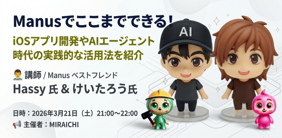 今回のセミナーでは、Manus ベストフレンドのHassy氏・けいたろう氏を講師にお迎えし、iOSアプリ開発からApp Store公開までを見据えた活用法に加え、AIエージェント時代における実践的な活用法についても紹介いただきます。