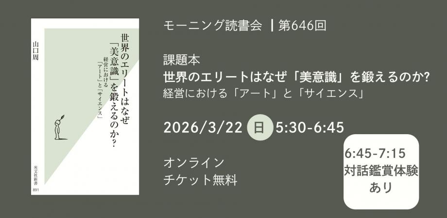 [持ち物]「世界のエリートはなぜ「美意識」を鍛えるのか?」山口 周 (著) ・一緒に本書を学び合うため、必ずご持参のうえご参加ください。 ・より良い対話の場にするため、当日までに本をご用意いただけない場合は、参加をご遠慮いただいております。 ・また、5:36以降のご入室はできませんので、あらかじめご了承ください。[当日のスケジュール]次の3ステップで知恵を融合する体験をしていきます。 ・ステップ1 短時間で深い学びを得るためのゴール設定 ・ステップ2 本、参加者との対話により知恵の融合を楽しむ ・ステップ3 学びを日常生活へとつなげるワーク[定員]10名[参加費]無料 ・本読書会は、多くの方に早朝から継続してご参加いただき、質の高い学びの場を創ることを目的として、参加費を無料としています。 ・ご参加の際は、相手の話に耳を傾けながら、共に充実した学びの場を作り上げていただけると幸いです。