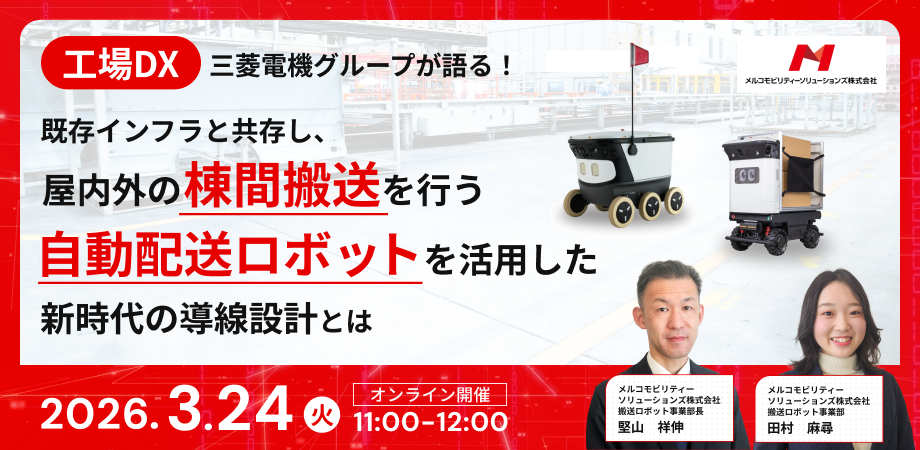 イベント詳細 【工場DX】三菱電機グループが語る!既存インフラと共存し、屋内外の棟間搬送を行う自動配送ロボットを活用した新時代の導線設計とは