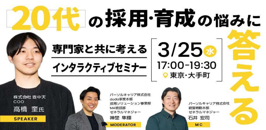 本セミナーでは、20代若手の育成やマネジメントを数多く支援してきた株式会社壺中天のCOO高橋氏を迎え、20代若手の「本音」や「価値観」に焦点を当て、参加者の皆様からの質問や疑問を受け付けながら、採用と育成を一貫して考えるためのヒントをお伝えします。