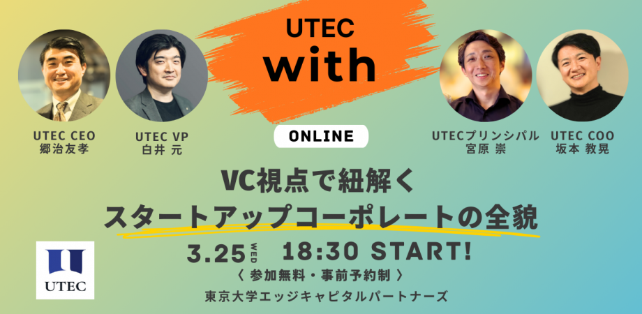 🌟コンテンツ🌟18:30 マクロ視点から読み解くスタートアップ業界なぜ今、テック系スタートアップの「コーポレート」が熱いのか?スタートアップ業界の盛り上がりを証明するマクロ要素とUTECの立ち位置を、UTEC CEOの郷治がご紹介します。18:45 スタートアップコーポレートのリアルUTEC COOの坂本と、UTECベンチャーパートナーの白井氏、UTEC投資担当の宮原が、スタートアップコーポレートの存在価値を紐解きます。19:15 Q&Aセッション 事前質問&当日チャットから、時間の許す限りお答えします!「どんな企業を選べばいいの?」「あえてリスクを取ってスタートアップを選ぶ魅力とは?」といった素朴な疑問も大歓迎!