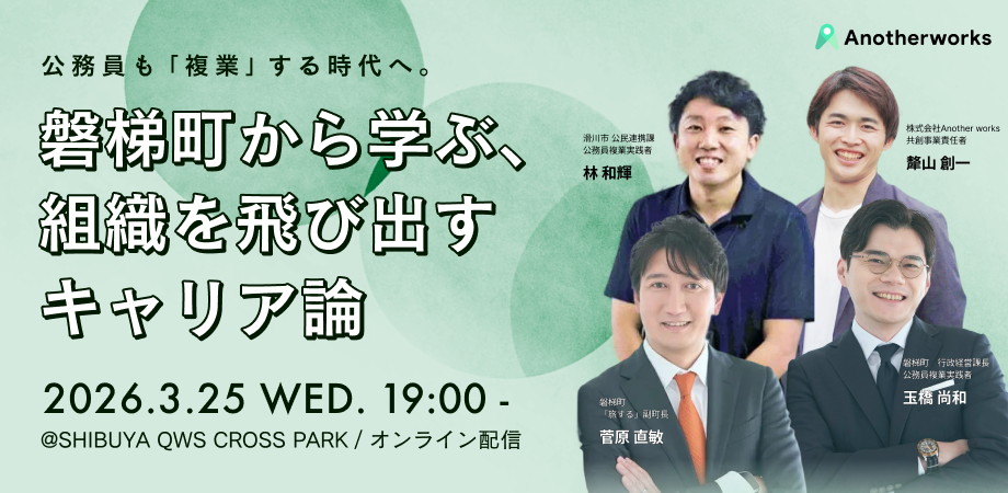 【趣旨】「公務員の複業解禁」という言葉が広まりつつある一方で、現場では「制度の壁」「心理的なハードル」「何から始めればよいか分からない」という課題が依然として存在します。本イベントでは、先進的なデジタル変革と積極的な複業人材登用で知られる福島県磐梯町と、複業マッチングプラットフォーム「複業クラウド」を展開するAnother worksが共催し、公務員の新しいキャリアを提案します。