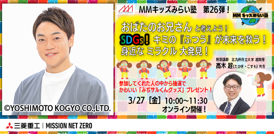 講師に北九州市立大学の高木超先生、ゲストにおばたのお兄さんを迎え、「世界規模の大きな技術」を持つ三菱重工と、「子どもたちの身近な一歩」を繋ぐイベントです!