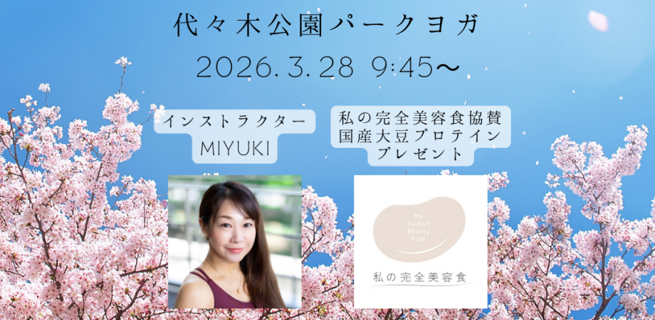イベント詳細 【春のお花見パークヨガ in 代々木公園 開催のお知らせ】 日差しがやわらかく春めいてきました。3月28日(土)代々木公園にて、春のお花見パークヨガを開催します。 青空の下、満開の桜を眺めながら身体を動かしてみませんか?「私の完全美容食」協賛、国産大豆プロテインをプレゼント。 初心者の方、お子様も大歓迎です。ご参加お待ちしています。 ーーー◾︎日時:2026年3月28日(土)集合:9時15分ヨガ:9時45分〜11時00分 ◾︎場所:代々木公園 ◾︎持ち物:ヨガマット、飲み物、タオル、羽織物、動きやすい服装※ヨガマットをお持ちでない方はブルーシートやレジャーシート+バスタオルでもご参加いただけます。 ◾︎参加費:2500円※「私の完全美容食」国産大豆プロテインプレゼント※桜菓子のお土産付き※小学生までのお子様参加費無料 ◾︎雨天時3月29日(日)同時刻に振り替えーーー お申込みいただいた方に、集合場所、注意事項等の詳細をお送り致します。ご不明点等ございましたら、お気軽にお問合せくださいませ。