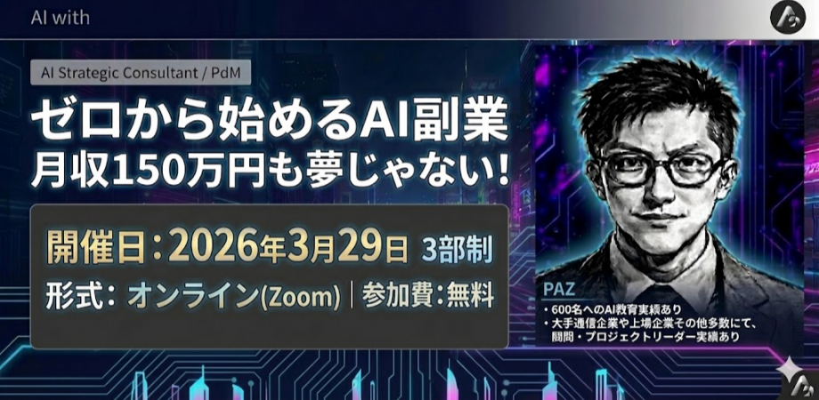 AIの導入が急務とされる今、多くの企業やビジネスパーソンが「具体的にどう事業へ組み込み、収益化に繋げるか」という壁に直面しています。本セミナーでは、広告・コンサル・プロダクト開発の現場でAI実装を主導してきたPAZ氏を招き、単なるスキルの習得に留まらない、ビジネス構造を革新するための3ステップを公開します。