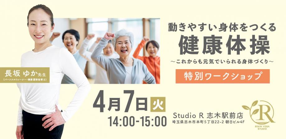 イベント詳細 \🌸春の特別企画🌸/毎日を楽にする 健康体操人生100歳時代。これから先も、自分の足で歩き続けるために。動きやすい身体をつくる健康体操〜これからも元気でいられる身体づくり〜がんばる運動ではなく、姿勢・バランス・足腰の土台を整え、これからの毎日を支える身体をつくります。・最近少し疲れやすい・足腰に不安を感じることがある・階段や段差が少し気になる・この先も元気でいたいそんな方にこそ、参加していただきたい時間です🌿🌸春の特別企画として50代以上の方が1名含まれていれば、親子・ご夫婦・ご友人とのペア参加OK。(※男性は女性申込のご家族・お知り合いに限ります)「父や母を誘ってみようかな」「一緒に始めたら続けやすそう」そんな春のきっかけにもぜひ✨【春限定・ペア参加特典】🎫2名で参加:4,000円(2,000円/1名)1名参加:2,500円(2,500円/1名)◼︎ 4月7日(火) 14:00〜15:00(60分)15枠🎫【講師】長坂 ゆか先生25年間、フィットネスクラブにてインストラクターとして活動。現在はパーソナルトレーナー・健康運動指導士として、一人ひとりの身体と丁寧に向き合いながらサポートしている。人生100歳時代を見据え、健やかに、自分らしく過ごすための健康維持・増進を目的とした運動指導を行っている。【サポート講師】井原ちえStudio R 志木駅前店 代表【開催場所】Studio R 志木駅前店埼玉県志木市本町5丁目22-2 朝日ビル4F【お申込み】Peatixにてお申し込みください🎫https://kt0407.peatix.com🌸あたたかくなり、身体も動かしやすくなる春。「何か始めたいな」と思っている方へ。この春、未来の自分のための一歩を踏み出してみませんか。 続きを読む 隠す