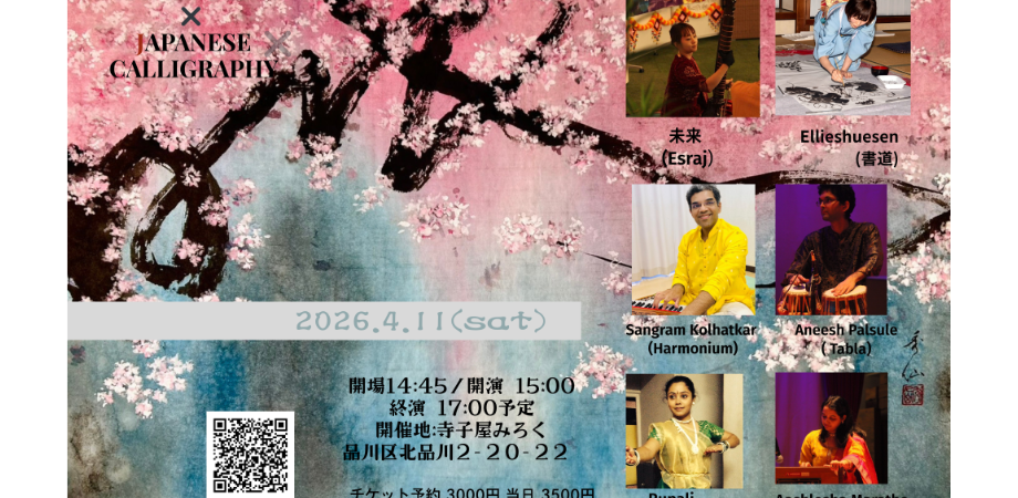 イベント詳細 【Indian Classical Music & Dance × Japanese Calligraphy】インド古典音楽& カタックそして、書道のパフォーマンスと共に春のコンサートをします。色彩豊かなプログラムです。