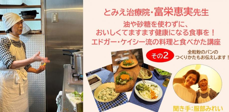 エドガー・ケイシー研究の第一人者、福田高規さんの一番のお弟子さんである富栄恵実先生(とみえ治療院|東京・立川)は、治療院でエドガー・ケイシー療法の施術や丁寧な指導を行うほか、各地で講座、講習会を開催されるなど、活躍中の治療家です。2025年10月に、油や砂糖を使わなくてもおいしい、エドガー・ケイシー流の調理法、食べものの摂取のしかたについて富栄先生にお話しいただいたオンライン講座では、ふだんの食生活や健康にご関心のあるたくさんの方々がご受講くださいました。今回、第2弾として、引き続き、食事のことをうかがっていきます。また、以前先生が美濃にいらしてくださったときにおもちくださった、全粒粉、豆腐、大根おろしやたっぷりのごまなどが入った手づくりのパ...