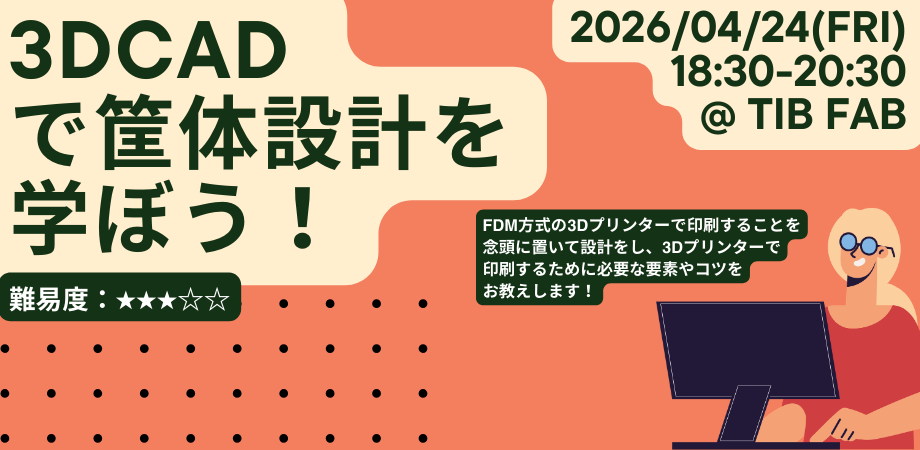 【イベント概要】名 称:【中級編】3DCADで筐体設計を学ぼう!内 容:筐体設計の基礎知識、赤外線距離計の筐体設計体験日 時:2026年4月24日(金)18:30-20:30(18:20 集合)会 場:Tokyo Innovation Base 2F TIB FAB参 加 費 :無料対 象:15歳以上定 員:6名主 催:TIB FAB運営事務局