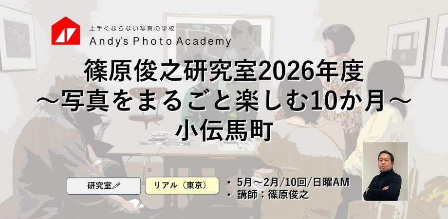 「篠原俊之研究室2026年度 ~写真をまるごと楽しむ10か月~ 小伝馬町」は「撮る」や「作る」だけでなく「作品を観る」ことも含めて文字通り写真を丸ごと楽しみそして体験する10か月です。篠原さんと、受講者同士で、時にゲスト作家と対話を繰り返しながら文字通り写真をまるごと楽しむことを体験していきます。