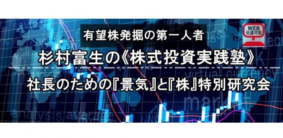 イベント詳細 ◆指導講師 杉村富生氏投資家応援団長経済評論家≪プロフィール≫軽妙な語り口と分かりやすい経済・市場分析に定評のある人気の経済評論家。兜町における有望株発掘の第一人者といわれ数々のヒット銘柄を輩出している。『個人投資家サイドに立つ』をモットーに投資家応援団長を自認する。金融・経済界に強力なネットワークを持ち、全国各地に熱烈なファンが多い。【主な内容】■どうなる?!日本の経済・景気と株式相場■本格的な『投資の時代』が到来!これから3年株で攻める‼■この絶好機を逃がすな!有望個別銘柄/売り買いのタイミング…■兜町における有望株発掘の第一人者が大化け候補株を渾身解説◆開催日時2026年 6月 11日(木)15:00~16:45◆会場銀座クレストンホテル(〒104-0044東京都中央区明石町8番 (聖路加ガーデン) TEL:03-5550-5700)◆参加費【1例会】 1名につき 48,000円 2名以上(1名につき) 43,000円(消費税を含む)◆主催日本経営開発協会:TEL03-3249-0666関西経営管理協会:TEL06-6312-0691詳細・お申し込みはこちら(関西経営管理協会/日本経営開発協会のセミナーお申込みページに遷移します) 続きを読む 隠す
