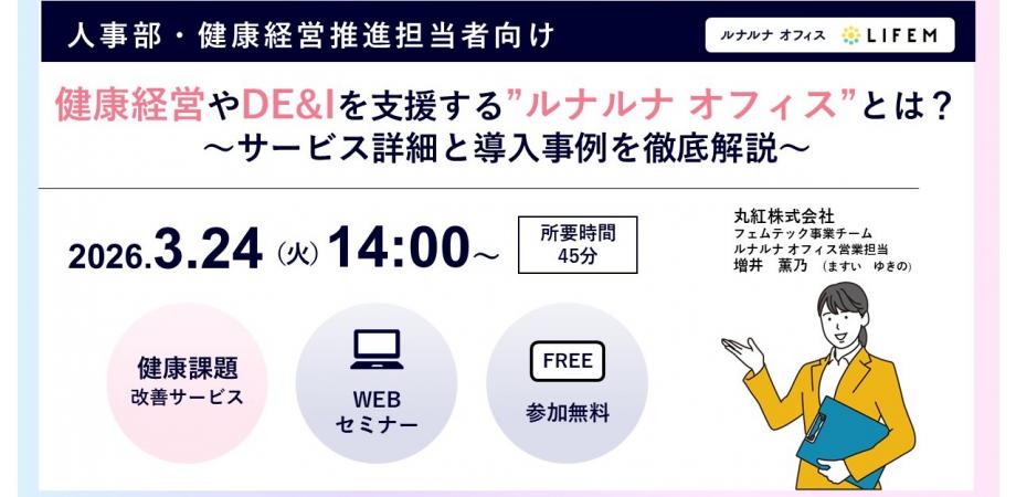 イベント詳細 2026年3月24日の14:00より、『健康経営やDE&Iを支援する”ルナルナ オフィス”とは?~サービス詳細と導入事例を徹底解説~』を開催いたします。