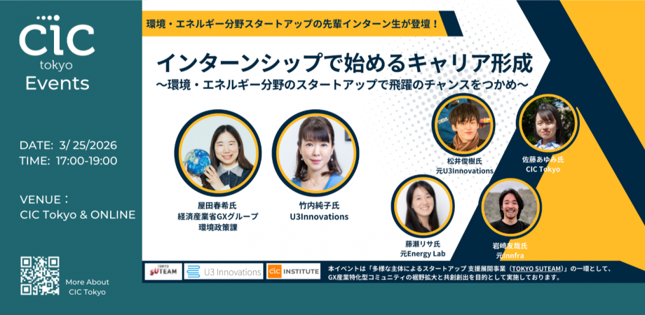 17:00-17:05 オープニング・リマークス17:05-17:20 環境・エネルギー分野のスタートアップへの期待と政策的支援 【登壇者】 ・経済産業省GXグループ環境政策課 総括係長 屋田春希氏 ・U3イノベーションズ 竹内純子氏17:20-18:10 インターンシップ経験者に聞く 【登壇者】 ・U3Innovations元インターン 松井俊樹氏(コンサルティング会社に就職) ・Innfra元インターン 岩崎友哉氏(同社に就職) ・EnergyLab元インターン 藤瀬リサ氏 ・CIC Tokyo現インターン ...