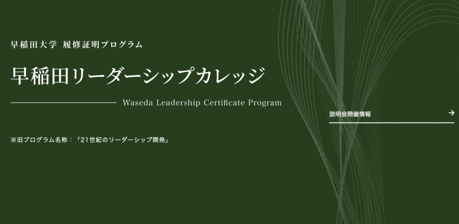 イベント詳細 *平日の開催のご要望を受け、追加実施が決定いたしました!【早稲田大学 履修証明プログラム】「早稲田リーダーシップカレッジ」オンライン相談会のご案内このたび、早稲田大学が提供する履修証明プログラム「早稲田リーダーシップカレッジ」について、オンライン相談会を開催いたします。