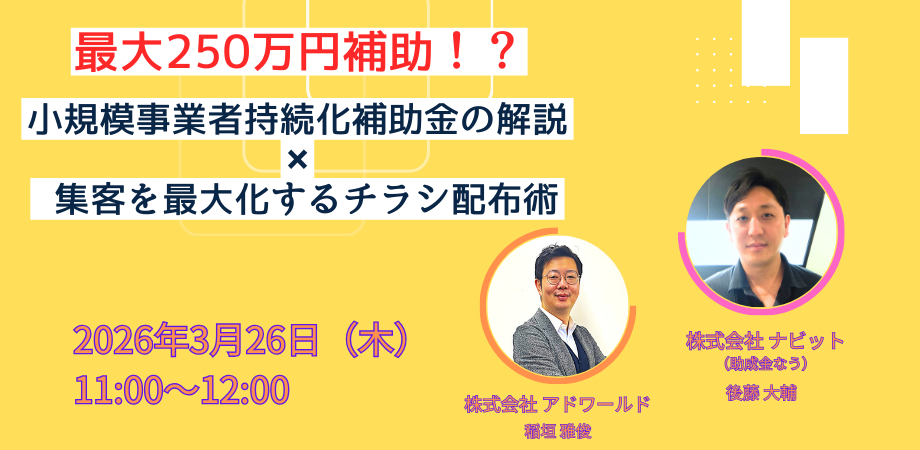本ウェビナーでは、企業の公的制度の活用アドバイザーとして、年間100件以上の支援経験を持つ株式会社ナビットの後藤大輔氏と、ポスティングのプロ集団アドワールドの稲垣雅俊がタッグを組み、「補助金を使って、手出しを最小限に抑えながら、最大の集客効果を出す」具体的なステップを60分で完全公開します。