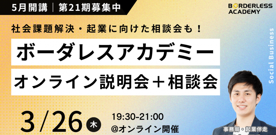 <当日お話しする内容>・累計120名以上の社会起業家が誕生!「ボーダレスアカデミー」とは・ボーダレスアカデミー各プログラムの解説・募集のご案内 ①2日間で「ソーシャルビジネスの作り方」「社会起業のイロハ」を学べる集中講座 ②3ヶ月で「ビジネスプランを完成させる」社会起業伴走プログラム・年間100名の受講生を起業伴走している事務局による質問会