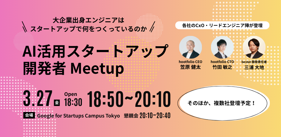 本イベントでは、AIを用いたプロダクトを開発する企業が集まり、大企業出身エンジニアがスタートアップで何をつくっているのか、そのリアルを語ります。 当日は Google for Startups Campus Tokyo を会場に、NEC研究所発の因果AIスタートアップ hootfolio、産業向け3Dデータ処理とAIを組み合わせたサービスを開発する bestat などが登壇。スタートアップならではの開発体制や意思決定について、クロストーク形式でお届けします。