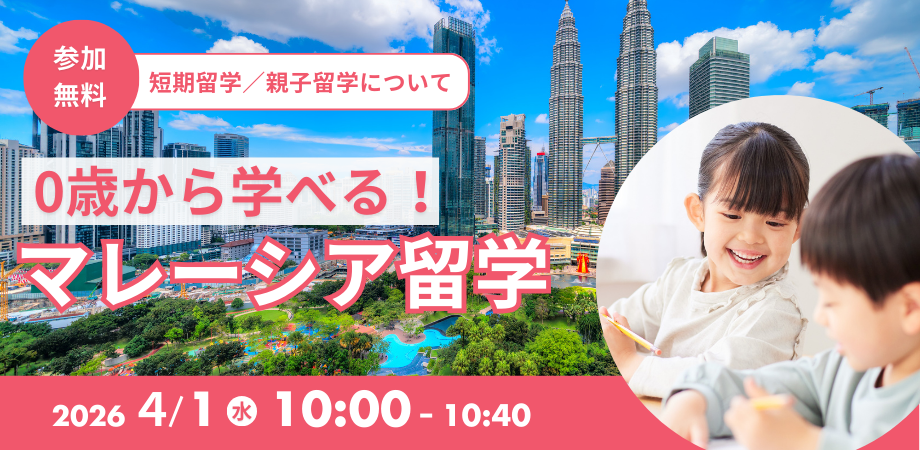 イベント詳細 こんにちは!マレーシア移住・留学コーディネーター Luchouette(ルシュエット) です。マレーシアでの教育移住や留学にご関心のある方におすすめの 無料セミナー を開催いたします!⸻★セミナー概要• テーマ:0歳から選べる!マレーシア留学• 日時:2026年4月1日(水) 日本時間 10:00〜10:40 / マレーシア時間 9:00〜9:40• 参加費:無料⸻★こんな方におすすめ!• 短期留学に興味のある方• お子さまの教育移住を検討中の方• 親子留学を体験してみたい方• マレーシアの生活や教育事情をもっと知りたい⸻★セミナー内容• マレーシアの基本情報• 言語・文化について• 英語力やIB(国際バカロレア)に関する注意点• インターナショナルスクール選びから入学までの流れ⸻★特典• セミナー後、初回30分の無料個別カウンセリングあり(事前予約可能)⸻★最新情報のご案内