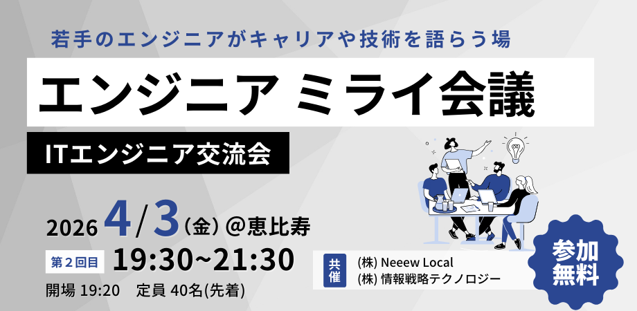 📅 日時:2026年4月3日(金)19:30〜21:30(開場19:20)📍 場所:情報戦略テクノロジー本社 (東京都渋谷区恵比寿4-20-3 15F)💰 参加費:無料👤 対象:ITエンジニア限定🎫 定員:40名(先着)