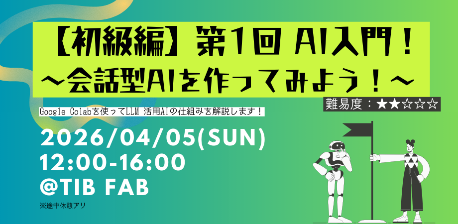 <イベント概要>名 称:【初級編】第1回 AI入門 〜会話型AIを作ってみよう!〜日 時:2026年4月5日(日)12:00〜16:00(11:50 集合)会 場:Tokyo Innovation Base 2F TIB FAB参 加 費:無料対象年齢:15歳以上定 員:5名主 催:TIB FAB運営事務局