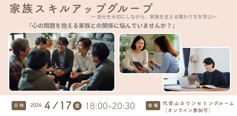 📅日時・開催方法 🗓 毎月1回(金曜日)18:00~20:30 🏢 会場:長谷川メンタルヘルス研究所(代官山カウンセリングルーム) ※対面で実施していますが、 オンライン参加も可能です(Zoom)