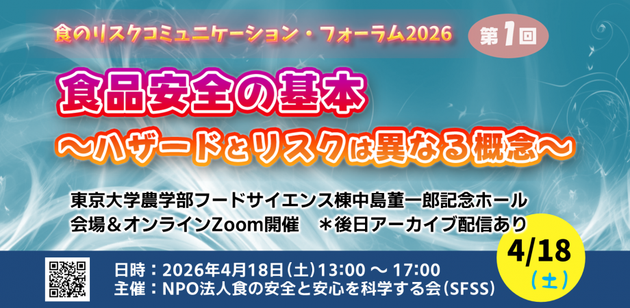 主 催:NPO法人食の安全と安心を科学する会(SFSS)後 援:消費者庁、東京大学大学院農学生命科学研究科賛助・協賛:キユーピー株式会社、旭松食品株式会社、カルビー株式会社、 株式会社セブン-イレブン・ジャパン、日本生活協同組合連合会、 サラヤ株式会社、東海漬物株式会社対 象:食品関連行政の担当者、食品事業者の広報・お客様相談・品質保証担当、 リスク研究者、メディア関係者、消費者団体・市民団体、栄養士、学生など定 員:会場:70名、オンライン:100名参加費:一般3,000円 (銀行振込にて事前納付いただきます) *SFSS会員、後援団体、協賛社(口数次第)、メディア(媒体名で参加)、栄養士、学生は 参加費無料ですのでSFSSホームページよりお申込みください。問合せ:SFSS事務局➡info@nposfss.com