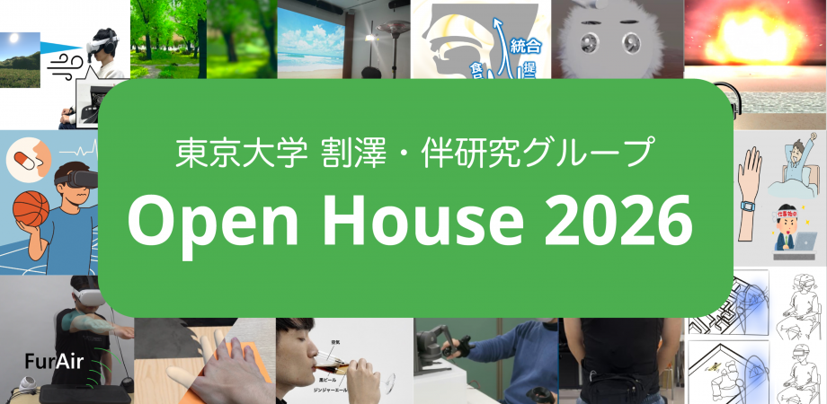 イベント詳細 割澤・伴研究グループは東京大学 大学院新領域創成科学研究科 人間環境学専攻における、人間環境情報学分野にて研究教育活動をおこなっています。当グループでは、生体情報解析や行動計測により感情やストレスなどの人の内部状態を推定し、情動や生産性の向上につながる五感へのフィードバックを通して、健康的で豊かな生活や新しい体験の実現を目指しています。研究ではソフトウェア(機械学習・生体情報解析・VR環境設計)とハードウェア(五感刺激提示装置)の両方に取り組み、「ひとの知覚・認知メカニズムの理解」を研究の軸とした上で、それらを元にして五感ディスプレイや人の能力拡張システムの設計・実装を進めています。センシング技術とフィードバック技術の両者に基礎を置いているのが当グループの特徴です。今年度も研究グループのオープンハウスを実施いたします。デモ・ポスター展示を通じて、錯覚を活用した五感ディスプレイや日常生活内におけるセンシング技術の可能性について体感いただきたいと考えております。皆様のご来場を心よりお待ちしております。