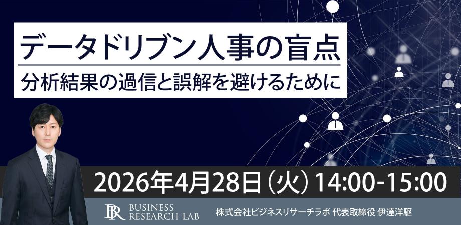 【開催概要】◆日時:2026年4月28日(火)14:00-15:00 ※本セミナーはオンラインセミナーです。◆定員:200名(先着順)※申込者には、セミナー終了後1~2週間を目途にアーカイブ動画のご案内をいたします。 当日ご都合がつかない方も、アーカイブでご視聴いただけます。◆参加費:無料◆登壇者:伊達 洋駆株式会社ビジネスリサーチラボ 代表取締役。神戸大学大学院経営学研究科 博士前期課程修了。修士(経営学)。2009年にLLPビジネスリサーチラボ、2011年に株式会社ビジネスリサーチラボを創業。以降、組織・人事領域を中心に、民間企業を対象にした調査・コンサルティング事業を展開。研究知と実践知の両方を活用した「アカデミックリサーチ」をコンセプトに、組織サーベイや人事データ分析のサービスを提供している。近著に『組織内の“見えない問題”を言語化する 人事・HRフレームワーク大全』(すばる舎)、『世界の研究者はマネジメントをどう分析しているのか』(労務行政)、『越境学習入門 組織を強くする「冒険人材」の育て方』(共著;日本能率協会マネジメントセンター)などがある。2022年に「日本の人事部 HRアワード2022」書籍部門 最優秀賞を受賞...
