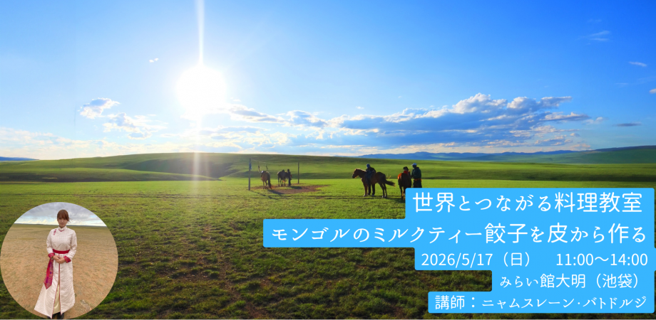 イベント詳細 毎回、大人気の「世界とつながる料理教室」。池袋の「みらい館大明」で、世界各国のまだ食べたことのない料理と出会ってみませんか?今回はモンゴル!「ミルクティー餃子」という名前のモンゴル料理を作ります。どんな料理なんでしょうか?!餃子は皮から作ります。モンゴルご出身のニャムスレーンさんに、モンゴルの夏のお祭り・ナーダムや、今のモンゴルの若者のトレンドなどをお話しいただきます。