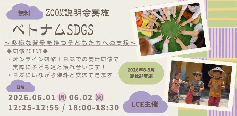 夏休みにオンライン+日本での実地研修でSDGsについて考えてみませんか?ベトナム人学生とチームを結成し、子どもたちの将来について真剣に考え、行動に移す、そんなプログラムです!長い夏休みにアルバイトやサークルだけでなく、なにかに一生懸命に取り組んでみたい!海外に渡航するのは少し大変、、、そんな方にピッタリのオンライン+日本での実地研修でできる海外交流!まずは説明会で話を聴いてみてください!!【Zoom説明会 開催概要】日程:06/01(月)・06/02(火)時間:各日12:25-12:55・18:00-18:30※全日程同内容です。【ベトナムSDGs~多様な背景を持つ子どもたちへの支援~】開催場所:オンライン(Zoom)参加条件:無料・事前お申し込み制講座対象:大学生、大学院生【その他】※本説明会はZoomにてインターネット配信いたします。ご視聴にはPC/タブレット/スマートフォンが必要になります。※ Zoomの接続テストサイト( https://zoom.us/test )にて、ご自身のご視聴環境を事前にご確認くださいますよう、お願いいたします。※内容等は都合により変更になる場合がございます。※登壇者への質問は、チャット欄にて受付いたします。全ての質問にはお答えできませんのでご了承ください。※講座の録画・録音、また第三者との共有はお断りしております。(感想等のシェアしてくださるのは歓迎いたします。)※PCやスマートフォン等の操作、環境設定、Zoomのクライアントソフトのインストール等に関するサポートはいたしかねます。ZoomのFAQページなどをご参照の上、ご自身での設定をお願いいたします。【主催・問い合わせ先】ライトハウス・キャリアエンカレッジ株式会社Website:http://www.lce-edu.com/takabatake@lighthouse-ce.com 続きを読む 隠す