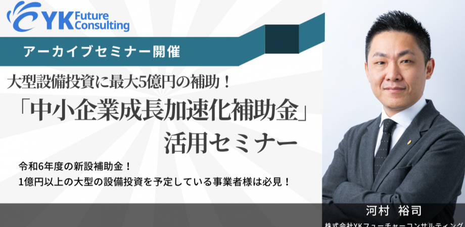 「『ものづくり補助金』、『事業再構築補助金』など他の補助金と何が異なるのか知りたい」2025年度に新設された「中小企業成長加速化補助金」は、売上高100億円を目指し、大胆な設備投資等を進める中小企業の成長の加速化を支援する制度です。設備投資や新規事業展開、人材確保・育成、DX化などを検討されている企業にとって、大きなチャンスとなります。本ウェビナーでは、補助金活用の専門家が「中小企業成長加速化補助金」の公募要領や活用方法、採択につながるポイント等について、どこよりも分かりやすく解説いたします。「今後の公募に向けて情報を集めておきたいという方」も大歓迎です!※本セミナーの概要解説動画となりますので、ご覧いただけますと幸いです。