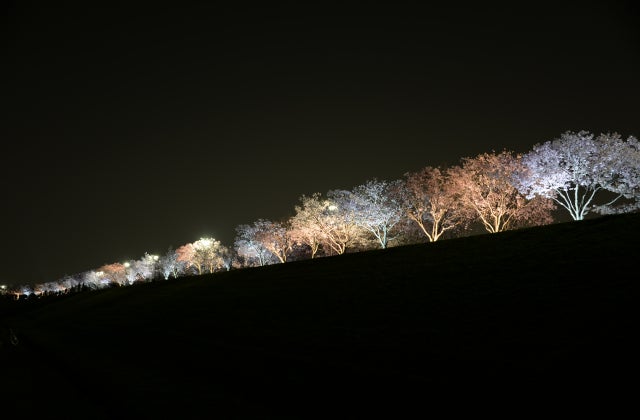 日本最古のダム式ため池「狭山池」。桜の名所として古くから知られており、公園として整備された周遊路には早咲きの品種「コシノヒガン」が立ち並びます。大阪府内で最も早く見ごろを迎え、3月下旬から満開のさくらの下でたくさんの人がお花見を楽しみます。北堤の桜並木は特に美しく、「桜まつり~春~」では、狭山池北堤に咲き誇る桜並木をライトアップで彩ります。日中の華やかな桜とは趣が異なり、夜のライトアップでは幻想的な雰囲気も楽しめます。