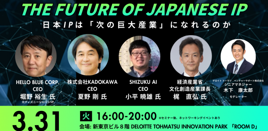 ・日本のIPはどのように世界市場で持続的な成長産業となり得るのか?・制作・投資・ライセンス・テクノロジーを組み合わせた新たなIPビジネスモデルとは何か?・グローバル市場において日本コンテンツの価値を最大化するために必要な戦略とは何か?といったテーマについて、経営・ライセンス・テクノロジー・投資の視点から多角的に議論します。