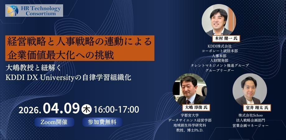日時:2026年4月9日(木) 16:00~17:00開催方法:Zoom参加費:無料テーマ:経営戦略と人事戦略の連動による企業価値最大化への挑戦: 大嶋教授と紐解くKDDI DX Universityの自律学習組織化