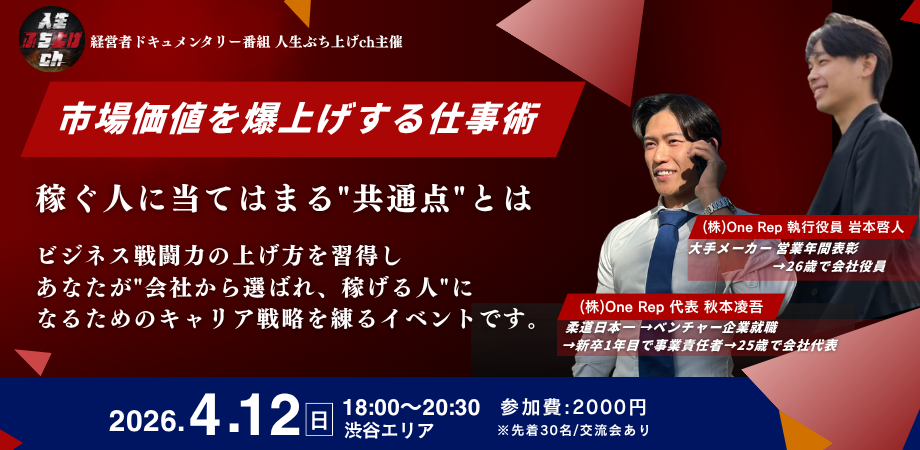 ━━━━━━━━━━━━━━━━登壇者━━━━━━━━━━━━━━━━■ 株式会社One Rep 代表取締役CEO 秋本 凌吾《柔道日本一 / ベンチャー企業就職 / 25歳で会社代表 / 人生ぶち上げch創設者》