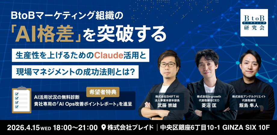 「BtoBマーケティング組織の『AI格差』を突破する」〜生産性を上げるためのClaude活用と現場マネジメントの成功法則とは?〜 申込枠を10名増員!BtoBマーケティング研究会イ... powered by Peatix : More than a ticket.